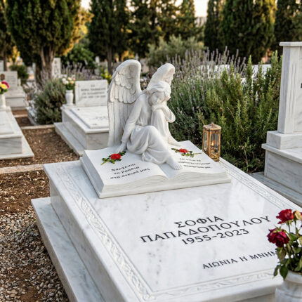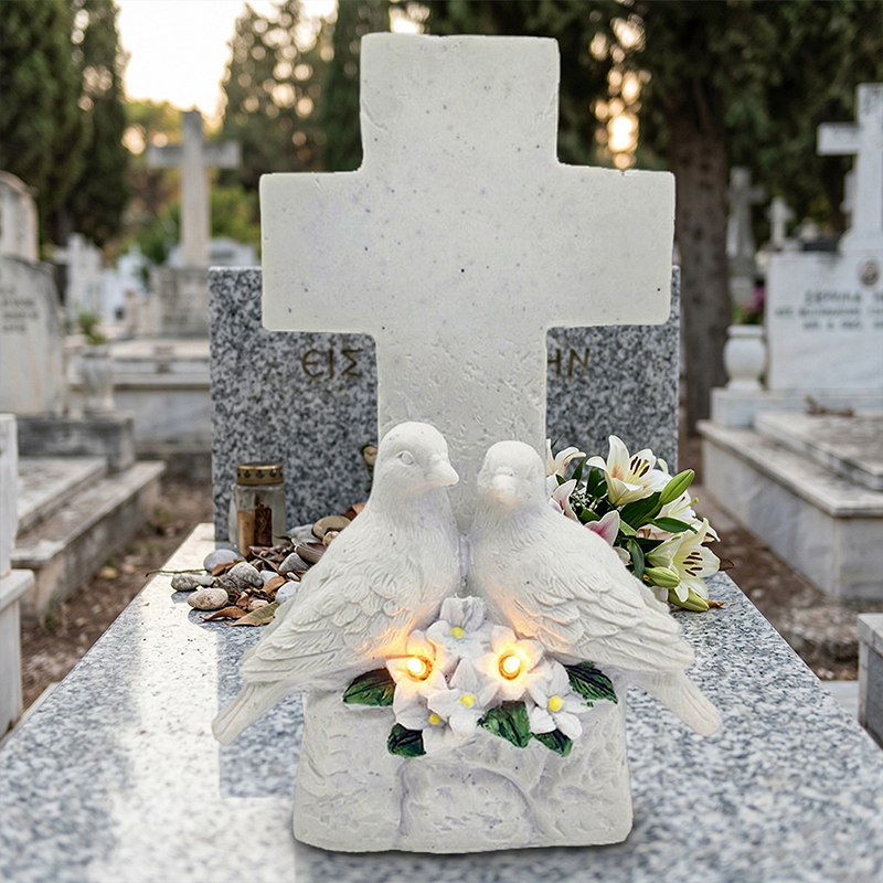 - Σταυρός με περιστέρια και φώτα led στα λουλούδια.